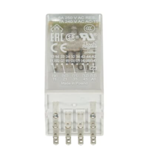 Pluggable 110 VAC interface relay with 4 changeover contacts (4CO), LED status indication, and test button—ideal for DIN-rail control panels and multi-circuit switching applications.