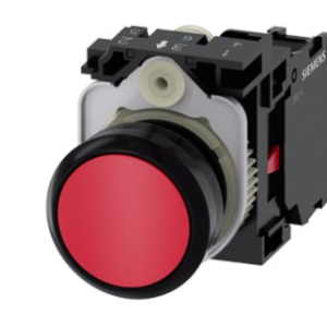 The 3SU1100-0AB20-1CA0 red pushbutton from Siemens is a 22 mm momentary control device with a flat actuator, one normally closed (NC) contact, and screw terminal connections. Designed for reliable operation in industrial control panels and machinery interfaces.