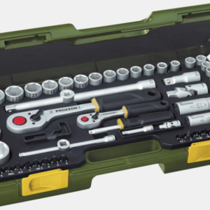 The Proxxon NO. 23 286 Industrial Tool Set is a 65-piece professional socket and ratchet set featuring 1/4" and 1/2" drive ratchets, metric sockets (4–34 mm), and precision screwdriver bits. Built from high-quality CrV steel, it delivers durability and high torque performance for mechanical and industrial applications.