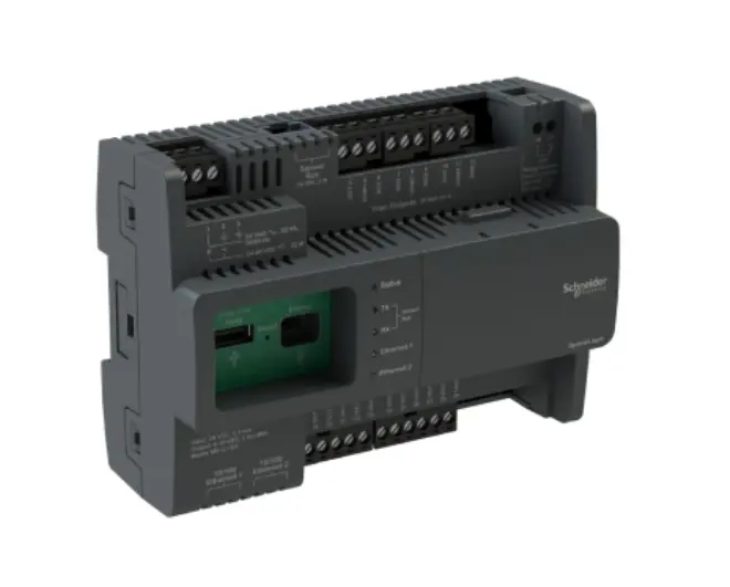 The SpaceLogic MP-C Controller from Schneider Electric is a versatile, multi-purpose IP-based field controller engineered for plant room and HVAC control applications. Fully programmable and BACnet/IP compatible, it can function as a standalone controller or integrate seamlessly into an EcoStruxure Building Management System (BMS) with AS-P, AS-B, or Enterprise Servers. With its B-AAC device profile, the MP-C ensures reliable communication and interoperability across devices. It supports up to three I/O expansion modules and features flexible topologies, including Star, Daisy Chain, and RSTP, for simplified network setup. The optional display provides local insight and control of system inputs and outputs, enhancing ease of maintenance and monitoring. Built for performance and scalability, the MP-C Controller is ideal for modern, connected building environments.