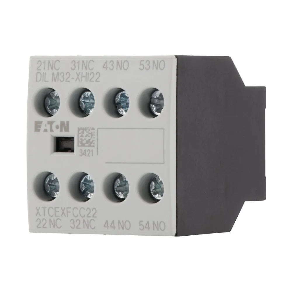 The Eaton Moeller series DILM32-XHI22 auxiliary contact module is a compact and reliable add-on accessory designed for use with DILM7-10 through DILM38-10 contactors.