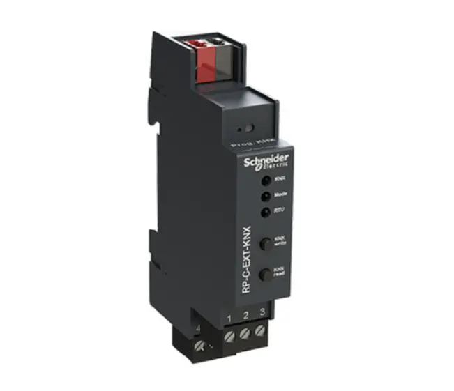 The SpaceLogic RP-C-EXT-KNX by Schneider Electric is a high-performance KNX Modbus gateway designed for integration with RP-C room controllers. It enables bi-directional communication between the controller and KNX devices such as lighting, blind control units, and temperature sensors.