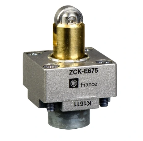 The ZCKE67 is a robust limit switch head from the XC Standard series by Schneider Electric, featuring a reinforced steel roller plunger. Designed for precision position detection in demanding industrial environments, it provides mechanical strength, long service life, and compatibility with a wide range of limit switch bodies in the ZCKJ series.