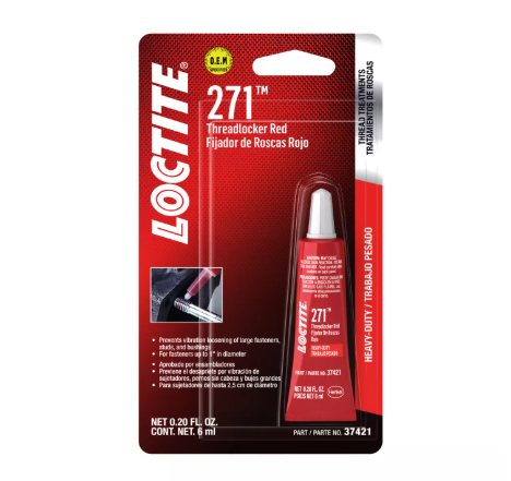 LOCTITE 271 Threadlocker (Part No. 487232) is a red, low-viscosity, high-strength anaerobic adhesive engineered to prevent loosening and leakage of threaded fasteners subjected to severe vibration and heavy shock loads.