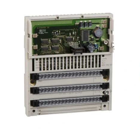 The Modicon Momentum 170ADI35000 is a 32-channel discrete input module designed for use with distributed control systems within the Modicon Momentum range. Operating at 24V DC with positive input logic, it offers 2 groups of 16 inputs, conforming to IEC 1131-2 Type 1 standards. The module includes 32 individual LEDs to indicate channel status, ensuring ease of diagnostics and operation.